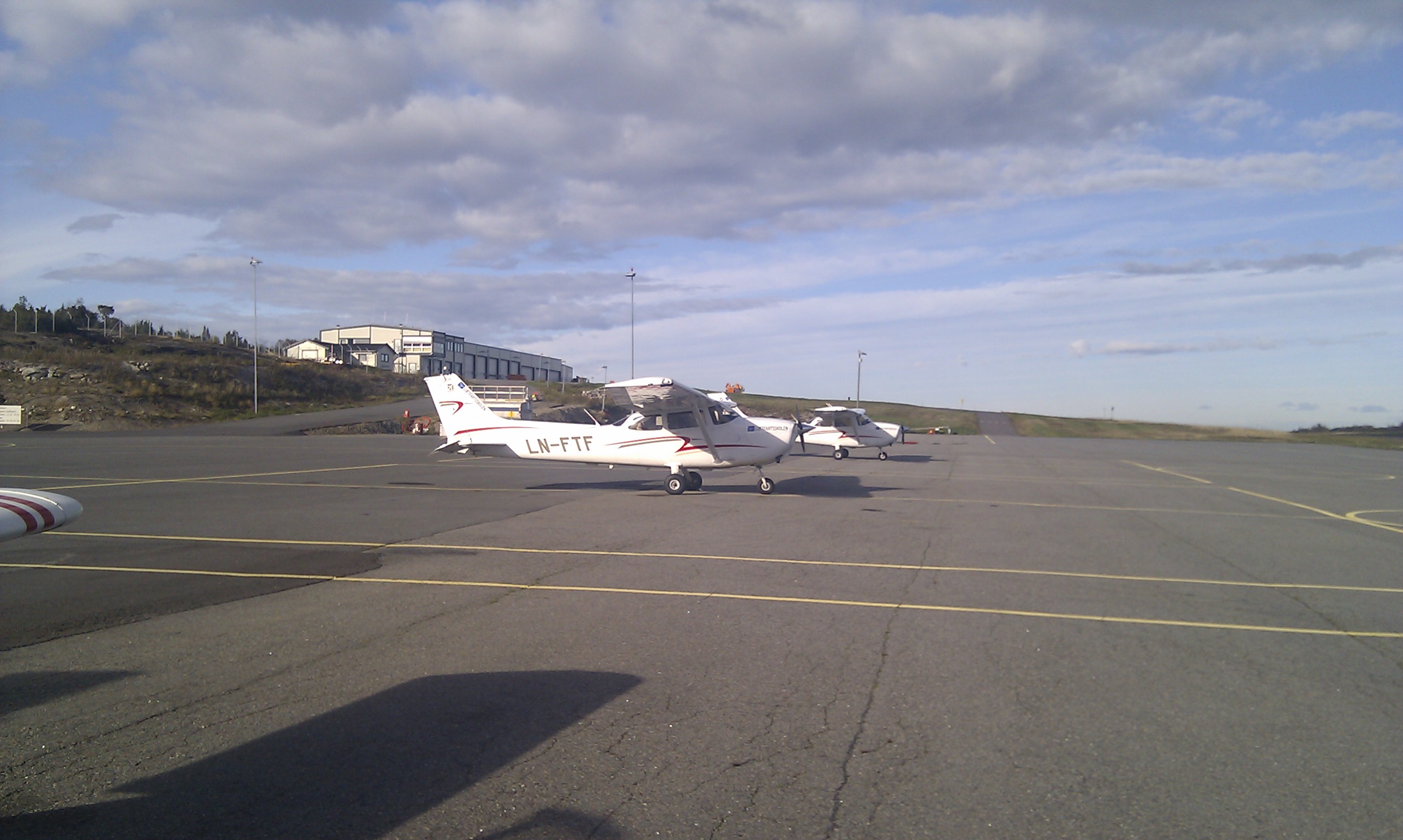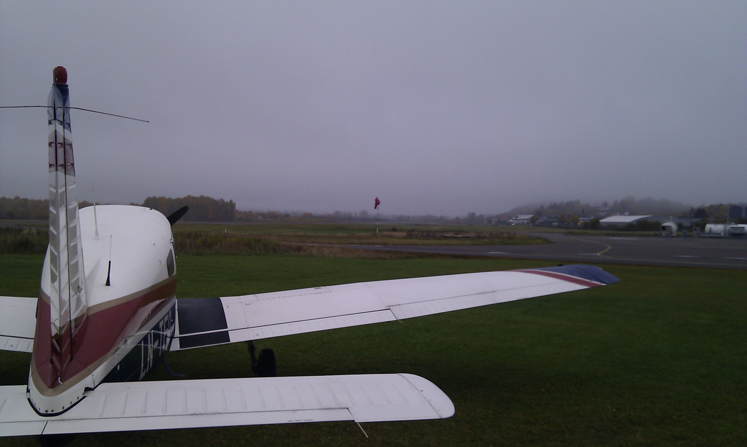 To navigasjonsturer har jeg hatt. So far so good! Men så kom det dårlige været. For første gang dukket jeg opp på Kjeller uten å få flydd. Tidlig en helgedag i oktober så det ut som på bildet under. Lavt skydekke i 200 fot, som ikke forsvant før etter kl. 12. Uka etter var det nytt forsøk, og jeg tok fri fra jobben for å få siste navigasjonstur med instruktør og progsjekk unnagjort. Jeg hadde allerede god tid i forveien planlagt to turer, en til Fagernes i nord og en til Torp i sør.